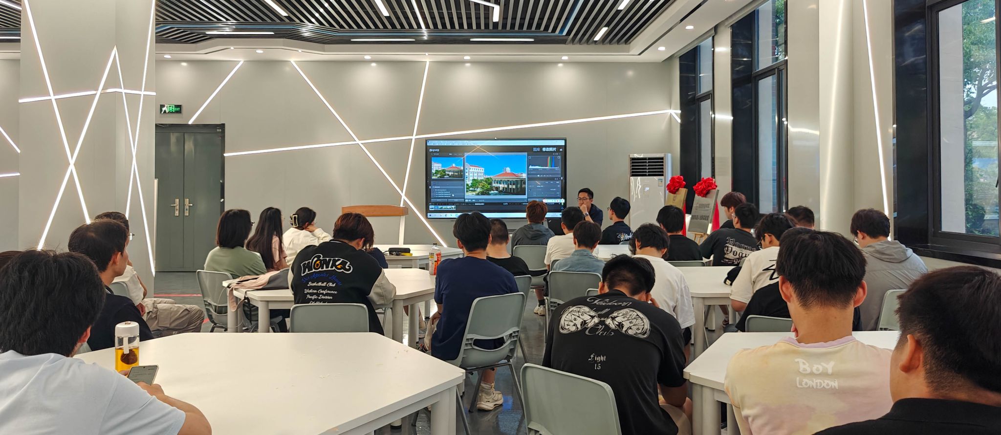 本次摄影成长计划的首场课程以“摄影基础与投展规划”为主题。卢啸老师为同学们详细讲解了单反相机的成像原理、拍摄过程中的构图与用光技巧,并针对后续摄影比赛的参赛要求与注意事项进行了细致指导。通过生动的案例分析和现场演示,让同学们对摄影艺术有了更深入的理解,激发了大家的学习热情。第二场课程聚焦“摄影后期流程与处理”。卢啸老师结合比赛后的获奖作品,分析了作品的创作思路与技术要点,并现场演示了Lightroom软件的全流程后期处理技巧。同学们在过程中了解了照片调色、裁剪、修饰等实用功能,感受技能提升对个人成长的助力。