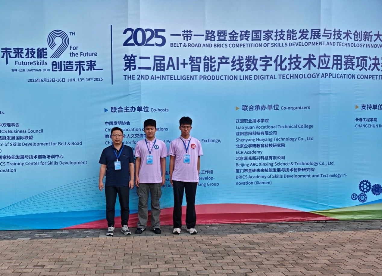 6月13日至16日,2025“一带一路”暨金砖国家技能大赛第二届AI+智能产线赛项决赛在辽源职业技术学院举行。来自国内外64所院校的125支队伍、249名选手同台竞技,围绕智能产线数字化技术展开激烈角逐。在师阳和周鑫鑫两位老师的指导下,智能制造学院学生张宸睿和李伟康在AI+智能产线数字化技术应用赛项中荣获三等奖。