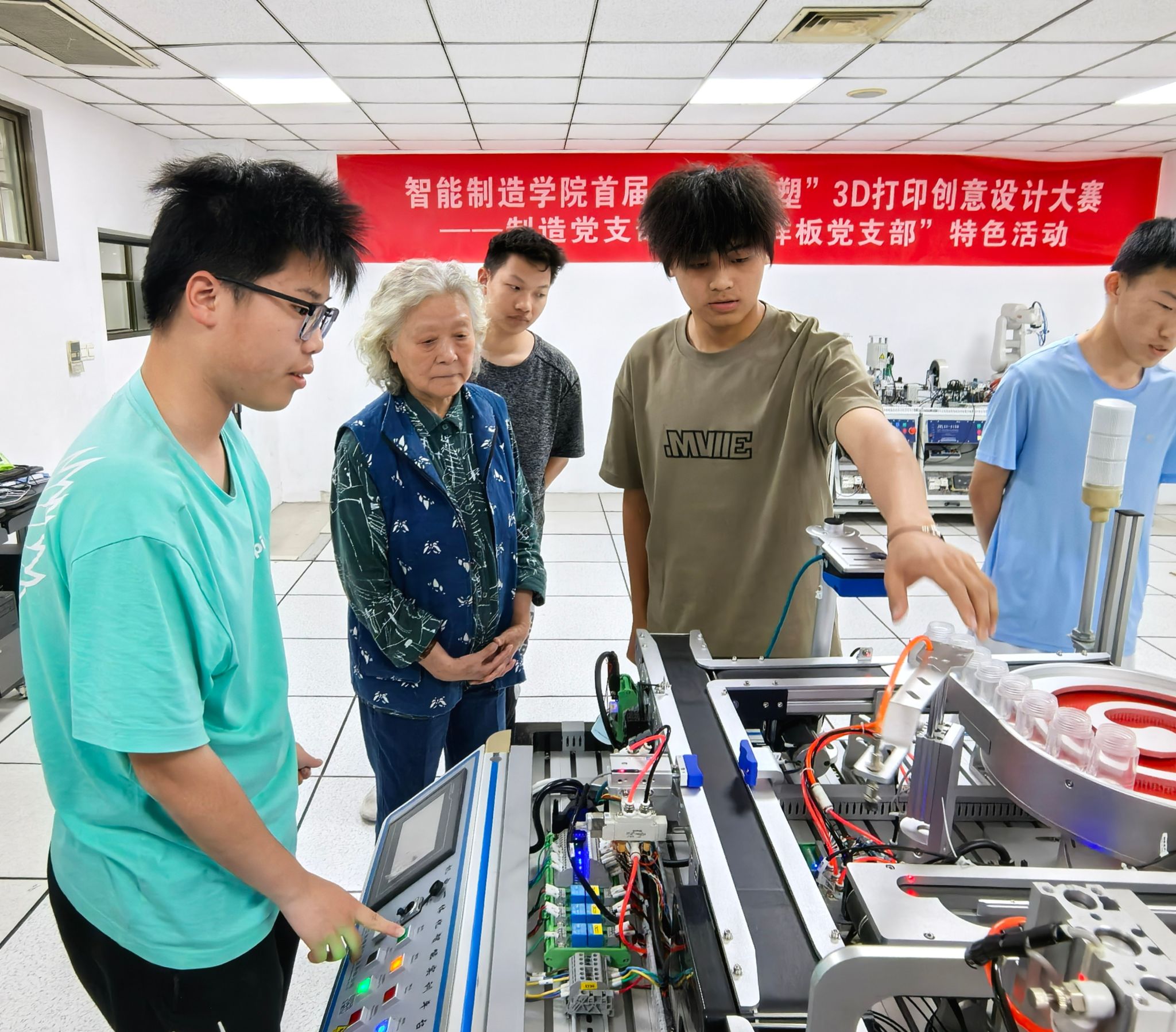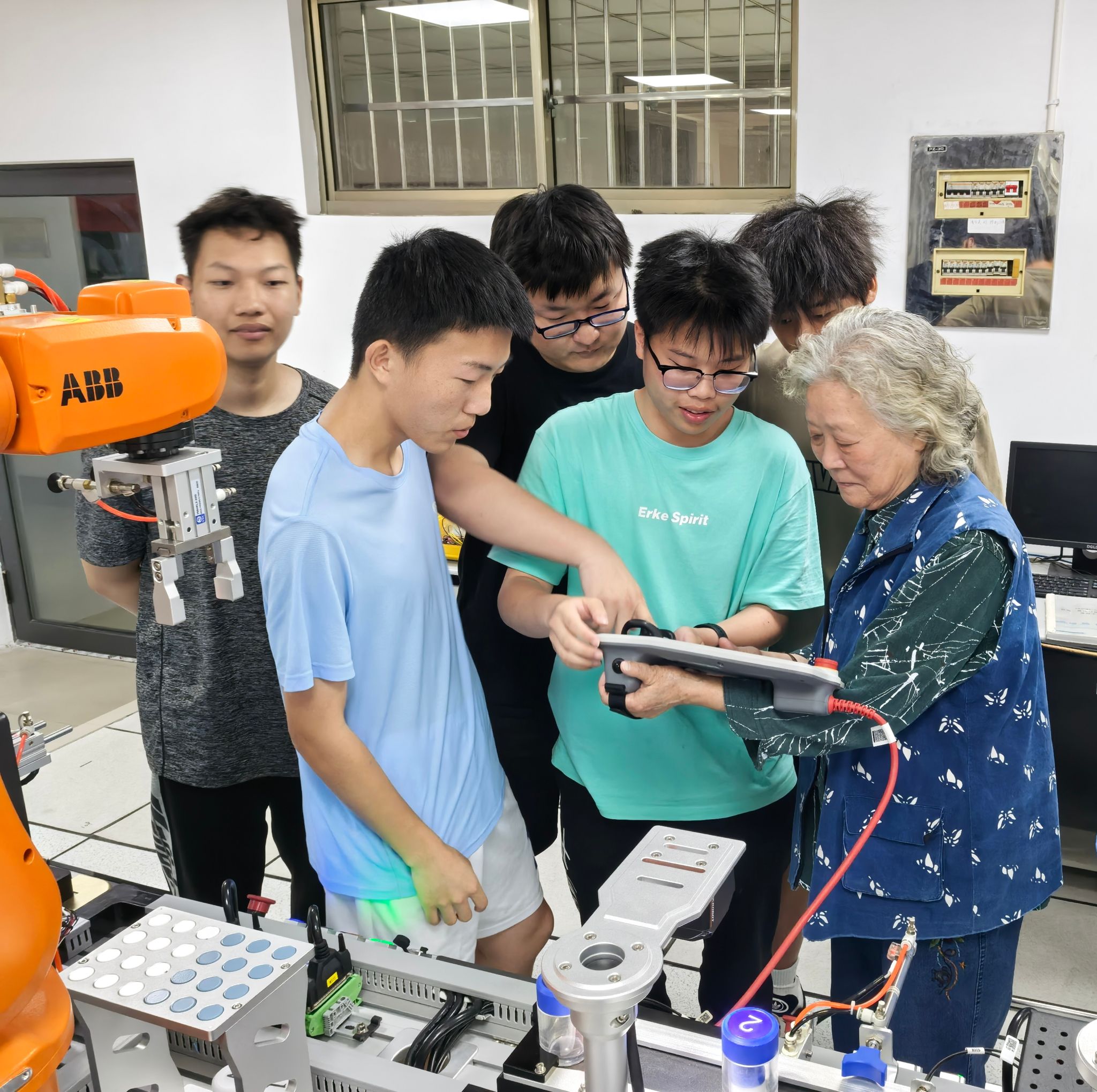 杨奶奶分享从教生涯中育人故事,引导学生思考智能制造领域如何平衡技术创新与人文关怀,树立“技术为基,匠心为本”的价值观,激励学生在技能大赛训练中展现专业能力的同时传承精益求精的工匠精神。同学们被杨奶奶的话语深深打动,大家纷纷结合自己在技能大赛训练中的实际情况,与杨老师展开了深入的交流和讨论。技能大赛集训的学生们向杨奶奶展示备赛成果,触摸智能机器人感受前沿科技的魅力。