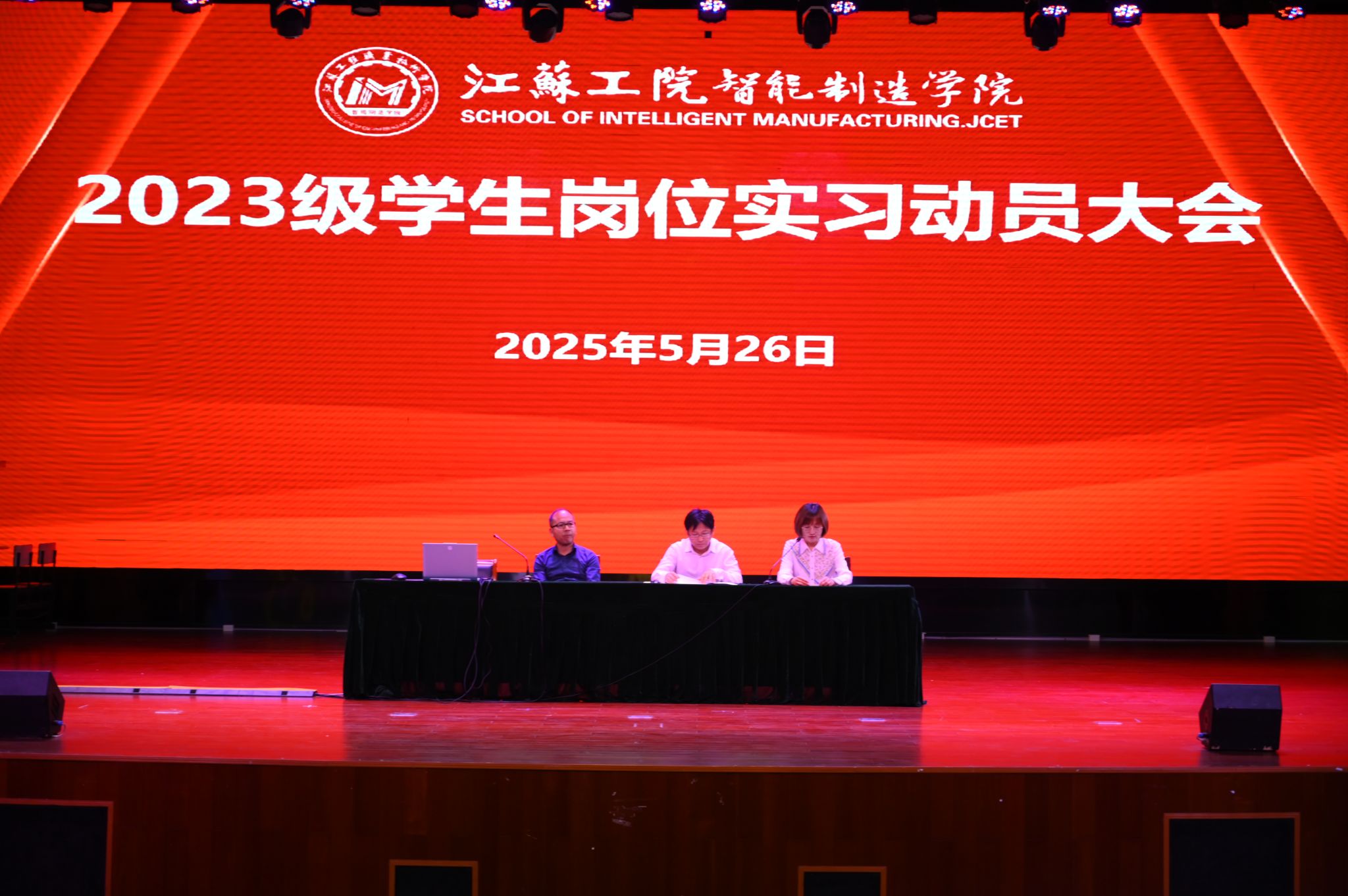 5月26日,智能制造学院在海门校区800人报告厅召开了2023级学生岗位实习动员大会。智能制造学院副院长胡志刚做岗位实习安全教育,党总支副书记保慧就树立正确职业观和全体2023级学生集体谈话,副院长朱海荣,对岗位实习、毕业设计提出要求。2023级全体学生,各班级班主任参加会议。动员大会由智能制造学院党总支副书记保慧主持。
